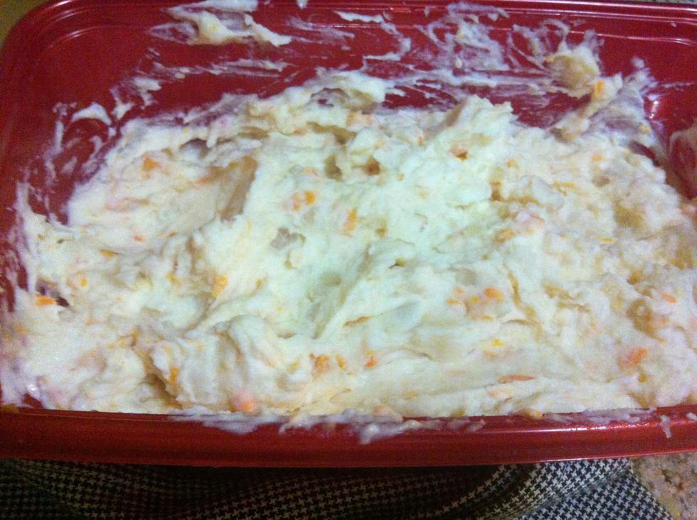 Chop carrots in tiny pieces and the potatoes in small cubes. This is when you would add finely diced boiled egg also. Dont mash potato it will break up later plus few lumps adds great texture too.