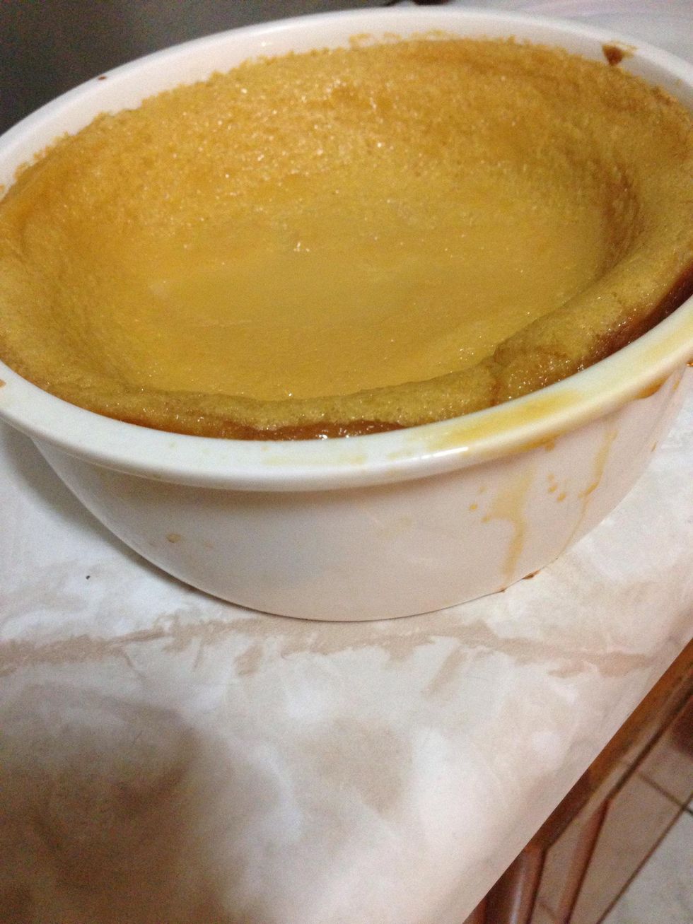 Add and spread the caramelized sugar to bottom of bake pan, should just cover it with 1/2 centimeter depth. After, pour contents of bowl to bake pan.