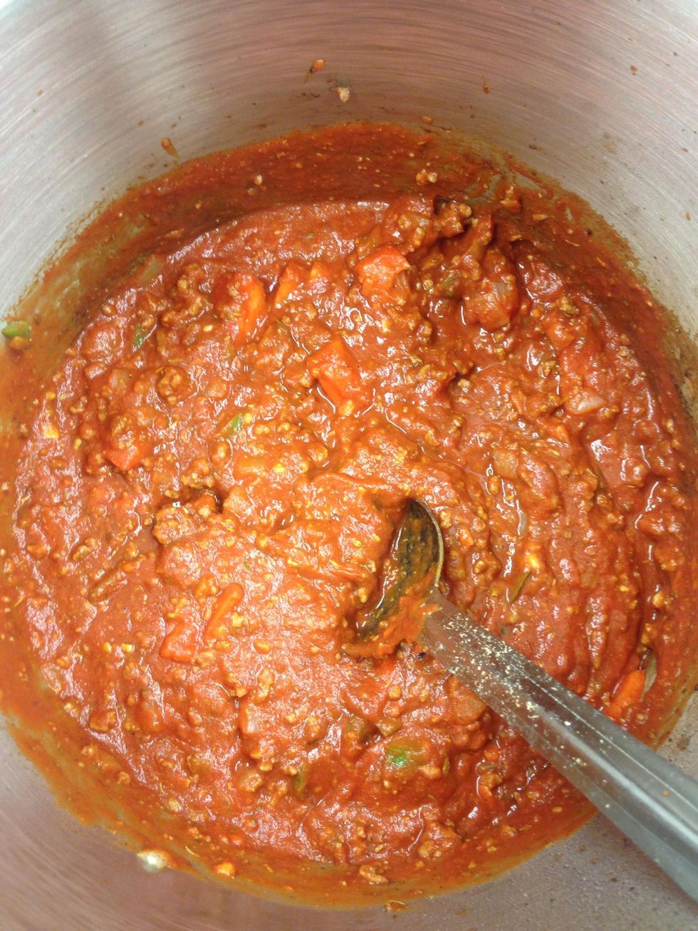 And reduce, then add meat back and tomato, tomato sauce and paste. And add Italian seasonings to taste. Water to thin down to desired consistency.
