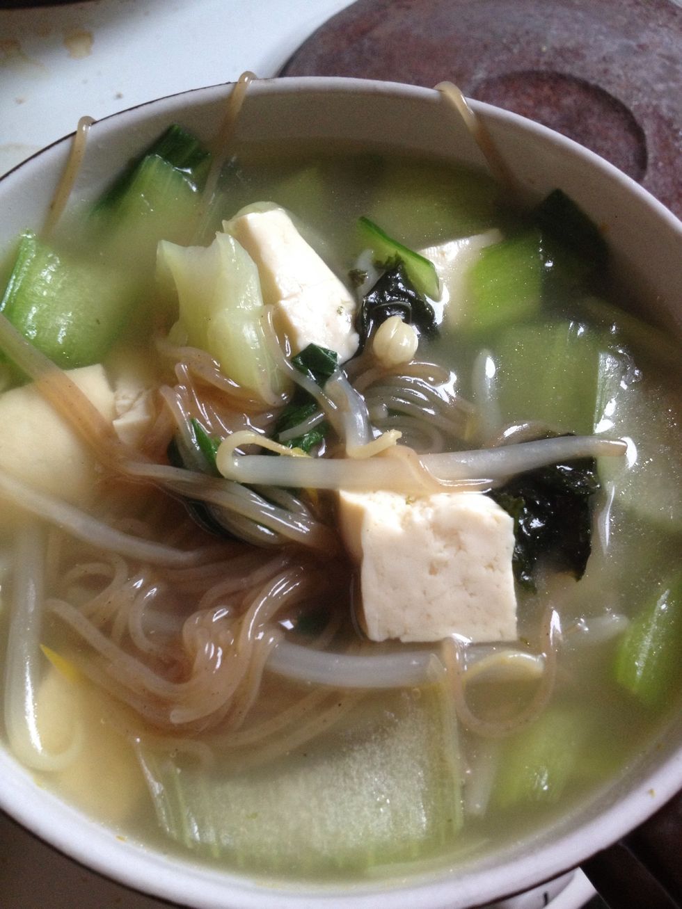 and shred the dried seaweed. Chop whichever veggies you're using. I combined it with bean sprouts so didn't have much chopping to do. In stead I did the dishes while waiting. :)