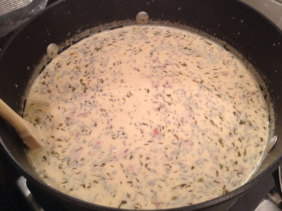 Once the shrimp have turned pink, add in the cream and half and half. Stir and bring to a boil. Then, reduce the heat to a simmer.
