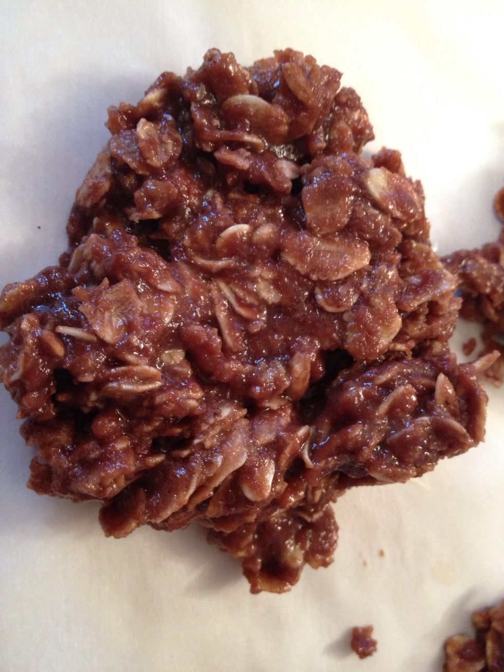 Once you've added the oats and peanut butter completely, quickly spoon cookies onto cold surface covered with wax/parchment paper.