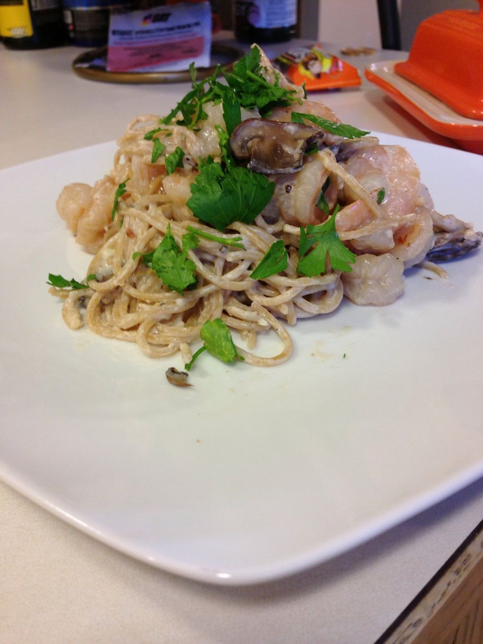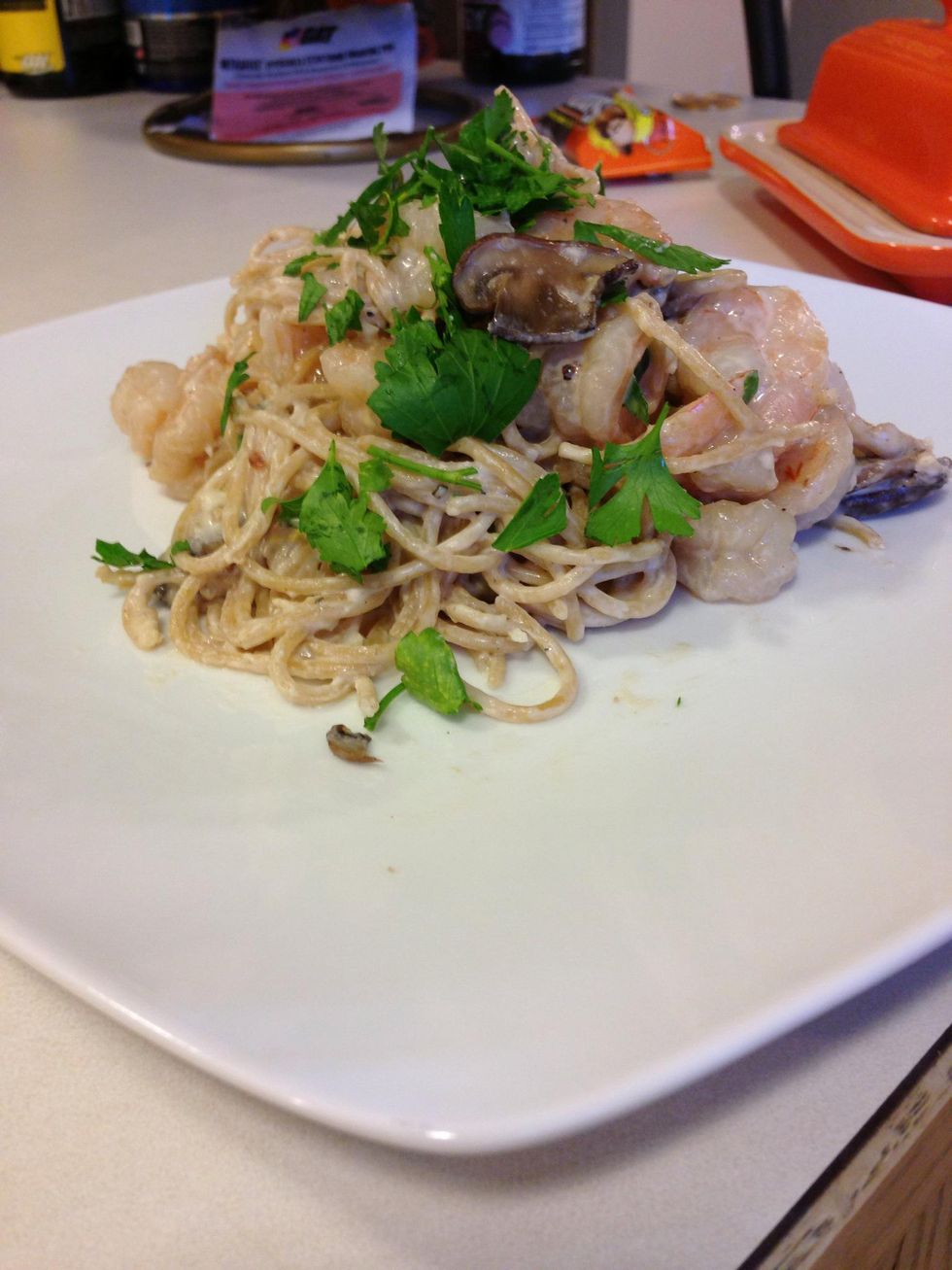 And then guess? Stir it in! Your sauce is done! Now you can mix the pasta, shrimp and sauce all together and serve or do what I do in the next steps....