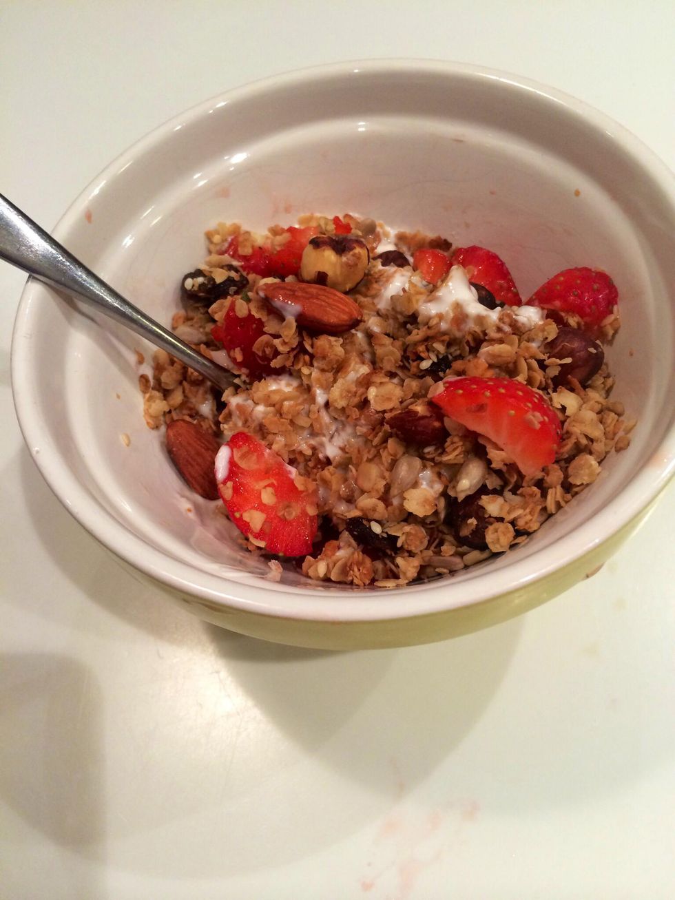 After approx 1.5 hours, check to see whether it's done. The oats and nuts should be evenly golden brown and crunchy. If they aren't, leave it to bake for longer, checking regularly. Remove from oven.