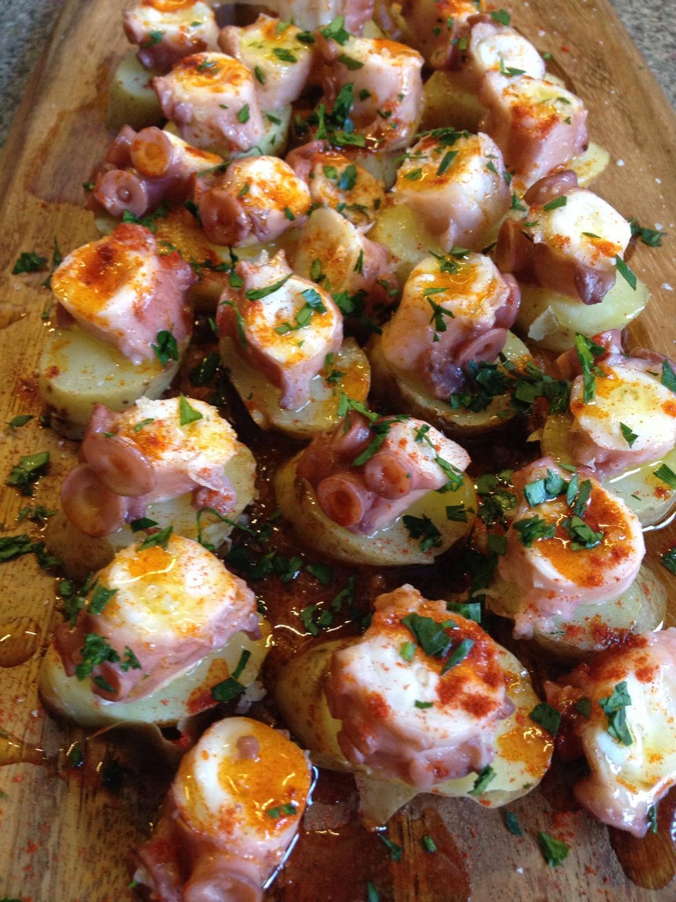Blanch the octopus 4 times. Place in the water for 15 seconds, lift out. Bring back to boil and repeat