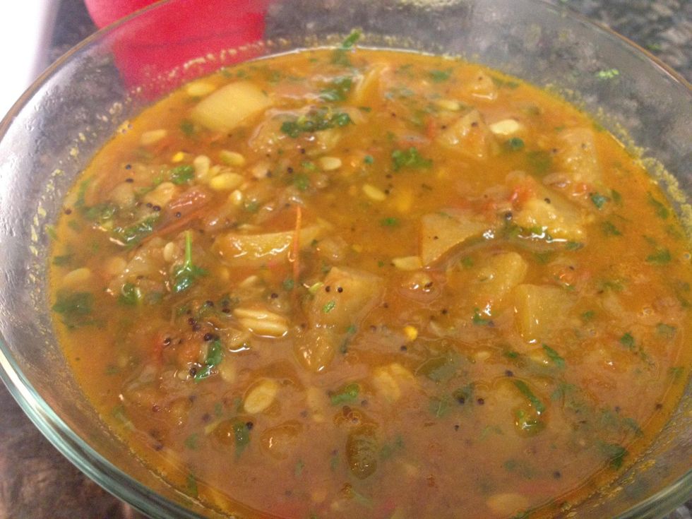 That's how it looks when it's done. Switch the stove on and let it boil till the water needs desired consistency shut the stove off and add chopped cilantro and mint.
