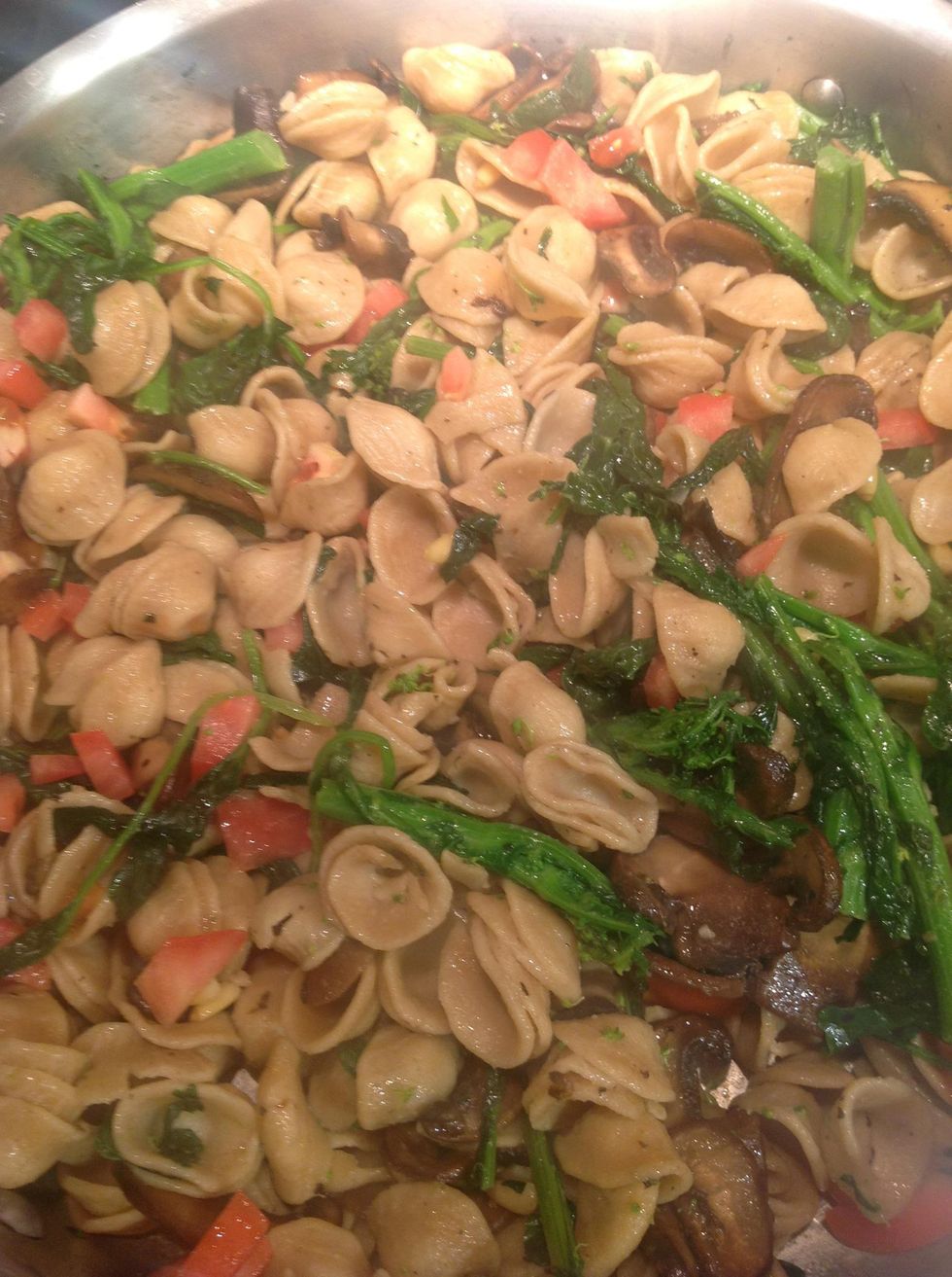 After 3 minutes add pine nuts, cook about 1 minute stirring occasionally. Add spinach and cover for 2 minutes then toss in pasta & mushrooms flavored olive oil and dried herb.