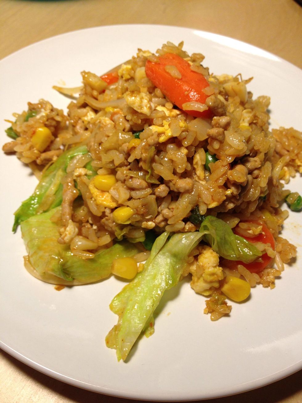 First add a little oil, with middle heat fried garlic and onion then add meat. Use another pan do the scramble eggs.