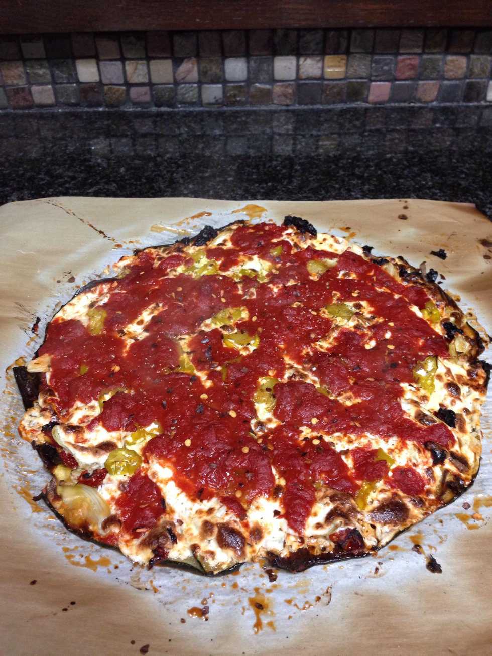 Gather what you like. I had onion, banana peppers, roasted garlic, marinated artichoke, and sun dried tomato. Use fresh mozzarella or you're fired. I cheated with the sauce (it's canned).