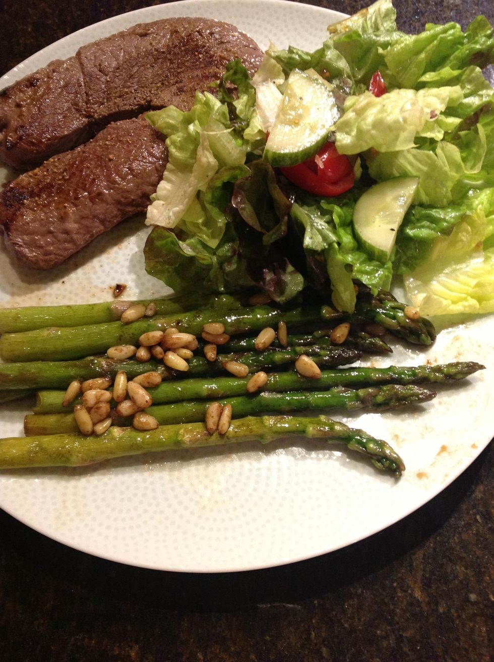 Add Soy Sauce and shake pan to coat asparagus, remove lid and add Pine nuts cook an additional minute or so.