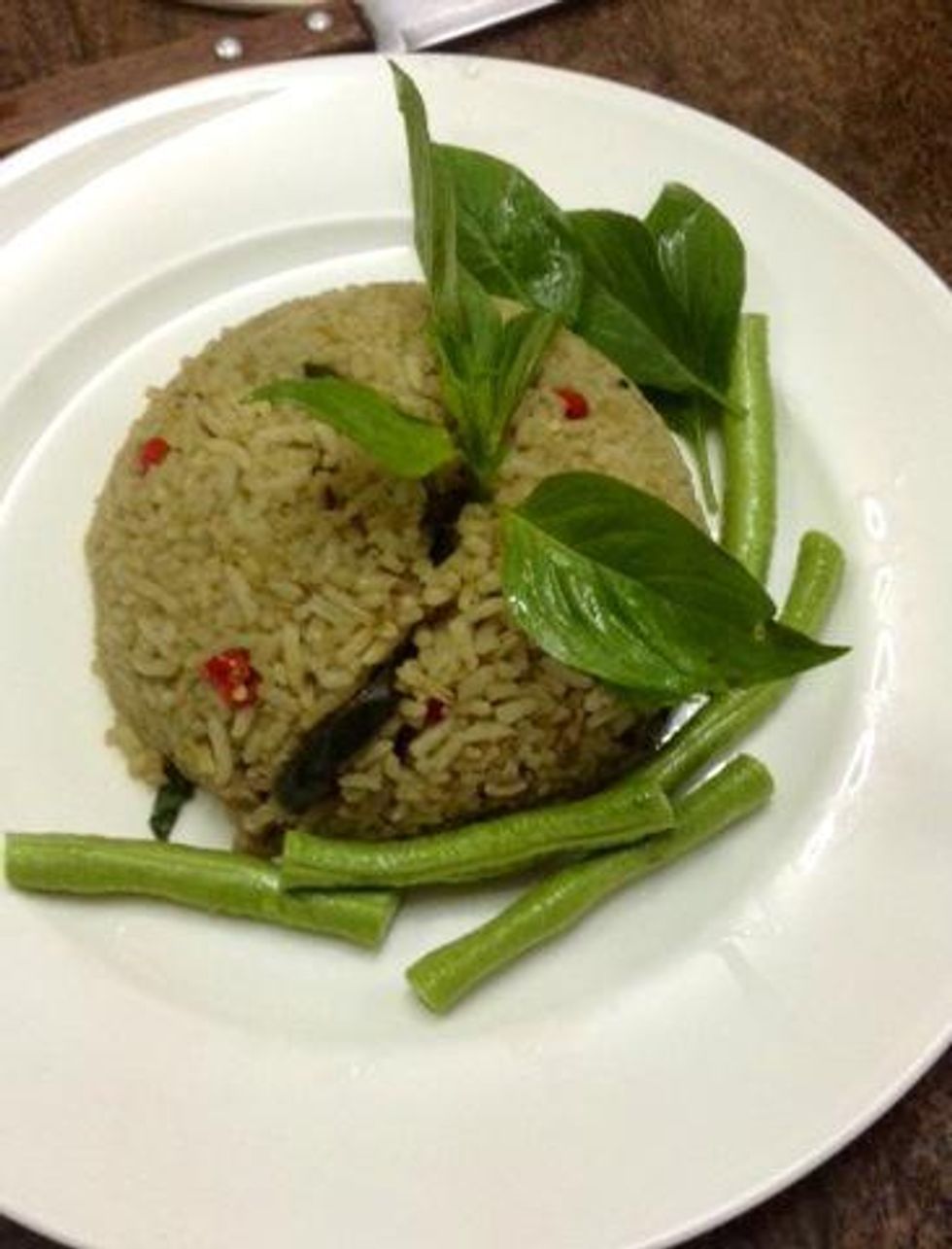 Spoon curry into a rice bowl and press firmly. Flip over onto the serving plate. Decorate with basil and serve with Tua Fuk Yao (Translated this is 'cow pea' which is a Thai bean).