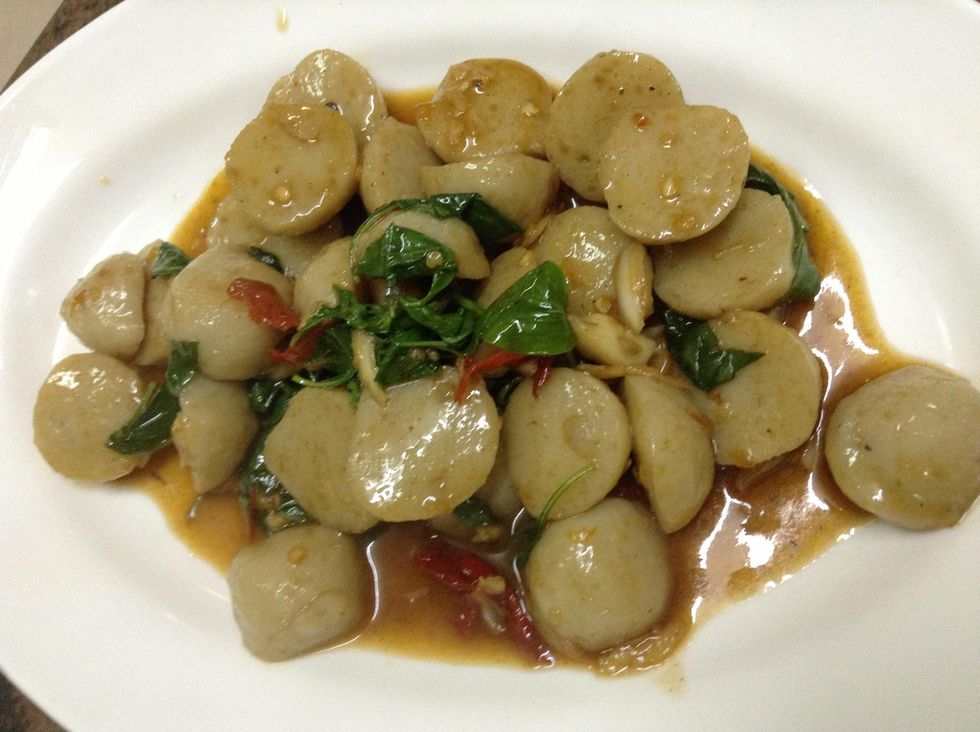 Chop the chili and the garlic into little pieces. Put in the pan when the oil is hot. Stir it around until it smells good. Add the Look Chin Pla and stir it together.