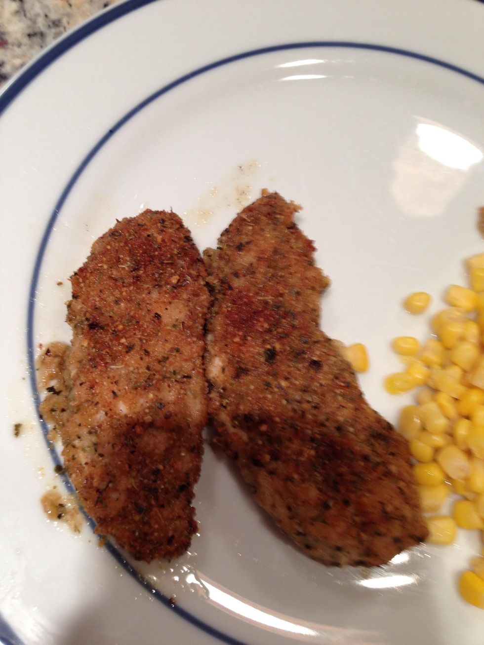 Remove melted butter from heat, dip chicken breast into melted butter mixture and then into the parm mixture. Coat both sides of chicken until completely covered.