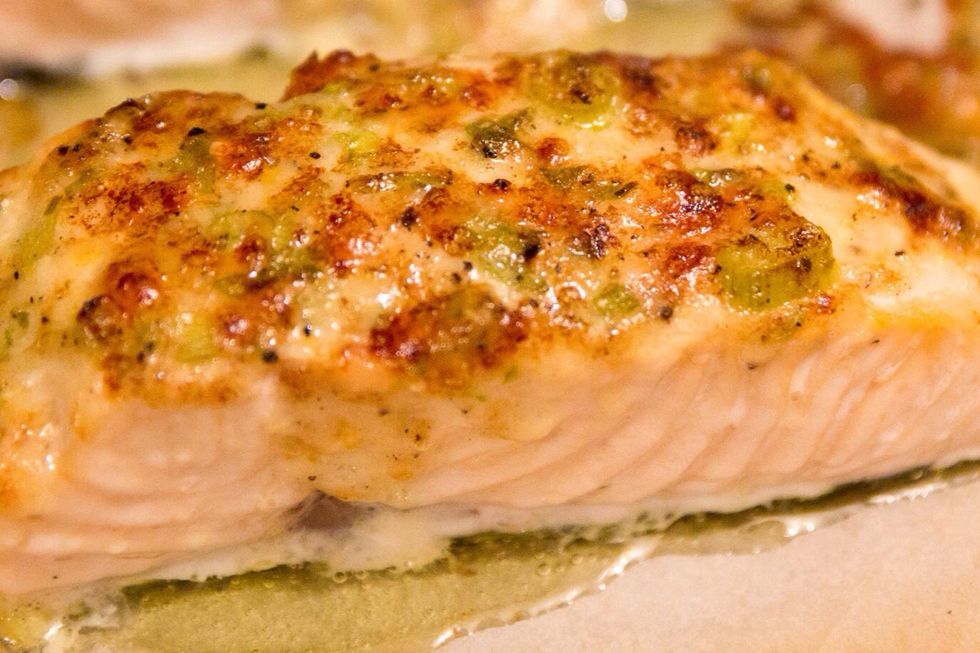 Have your assistant top the salmon with your Parmesan mayo mixture.