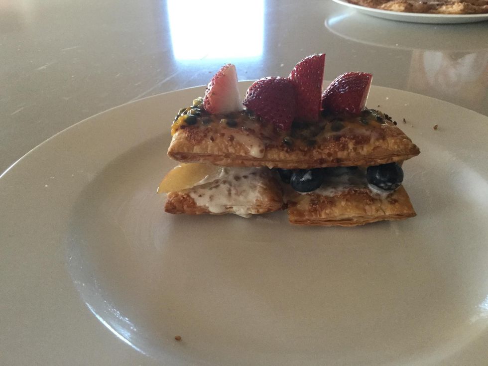 Assemble by putting pastry without glaze on the bottom with the yoghurt and cream mixture. Add fruit with the yoghurt. Put top layer on with more fruit. Lay passionfruit pulp on the top layer