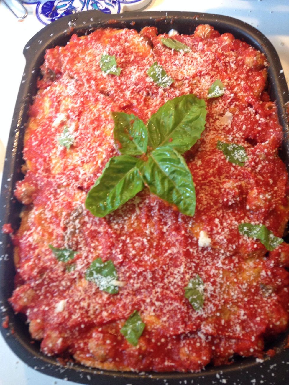 Finish cooking in the oven at 180 celsius degrees for 30 minutes, then decor with basil leaves and grated parmesan. Serve at least 30 minutes after taking the tin out of the oven. Enjoy it!