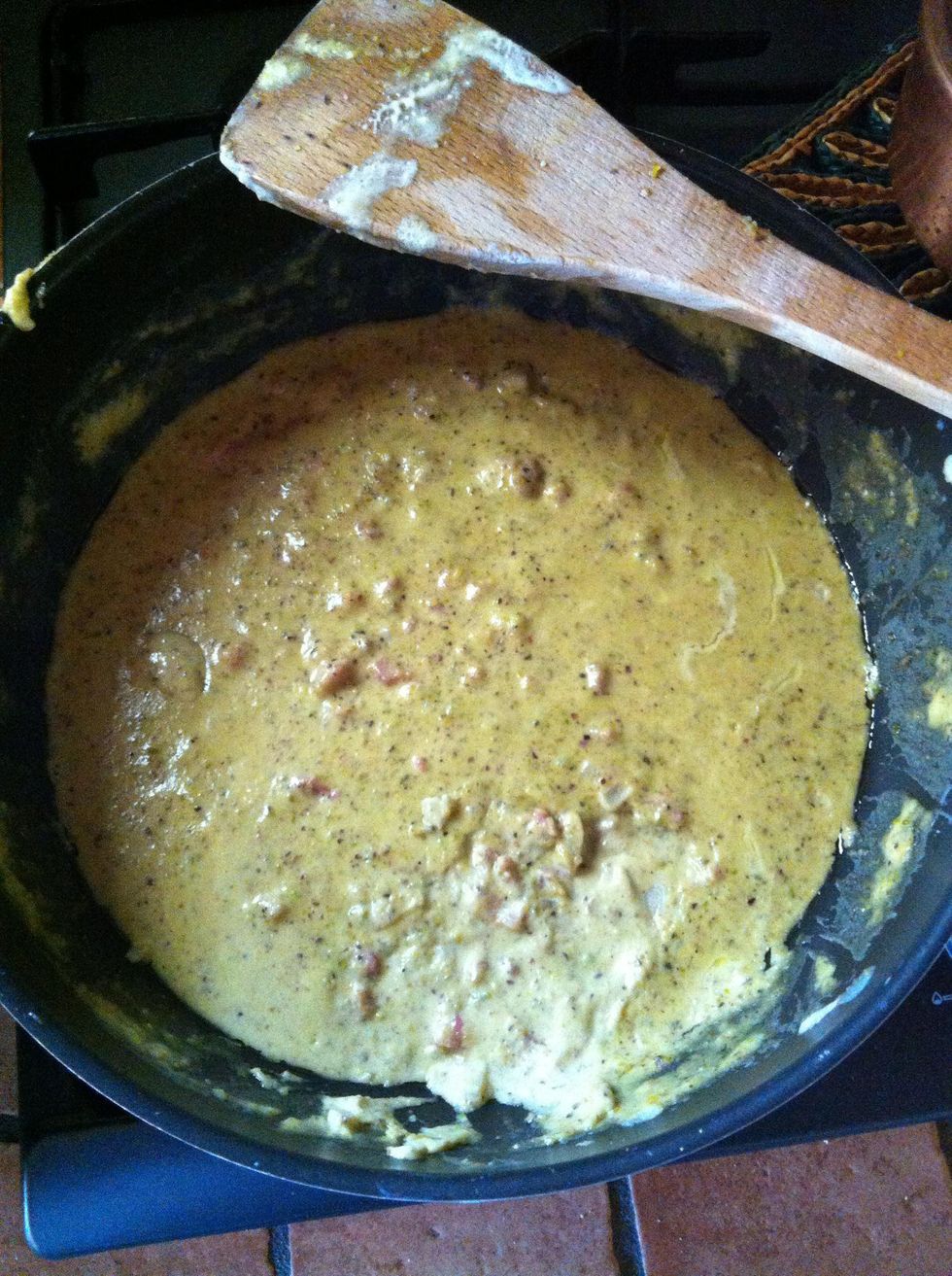 Lightly fry the onion. Add bacon and let it fry a little. / soffrigere la cipolla e aggiungere la pancetta. Lasciate soffriggere un p\u00f2.