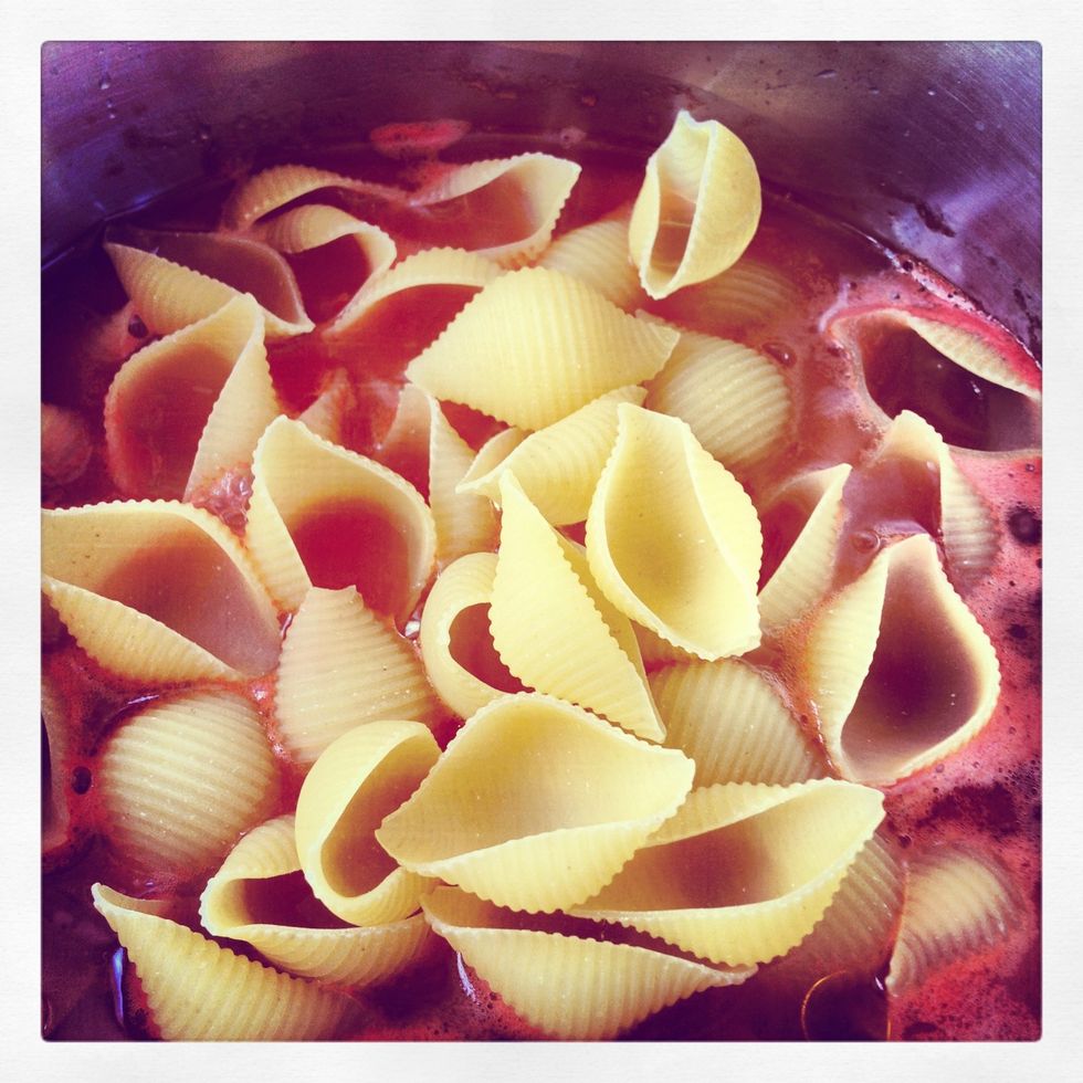 Add pasta. I chose Conchiglioni (big shells) but any kind of 'short pasta' will make it. Cook it 15-20 mins, low heat. Stir every now and again. Don't let it overcook :)