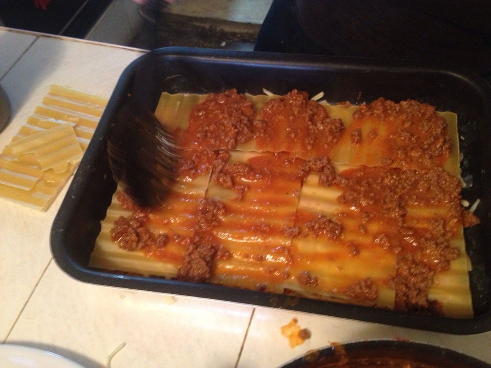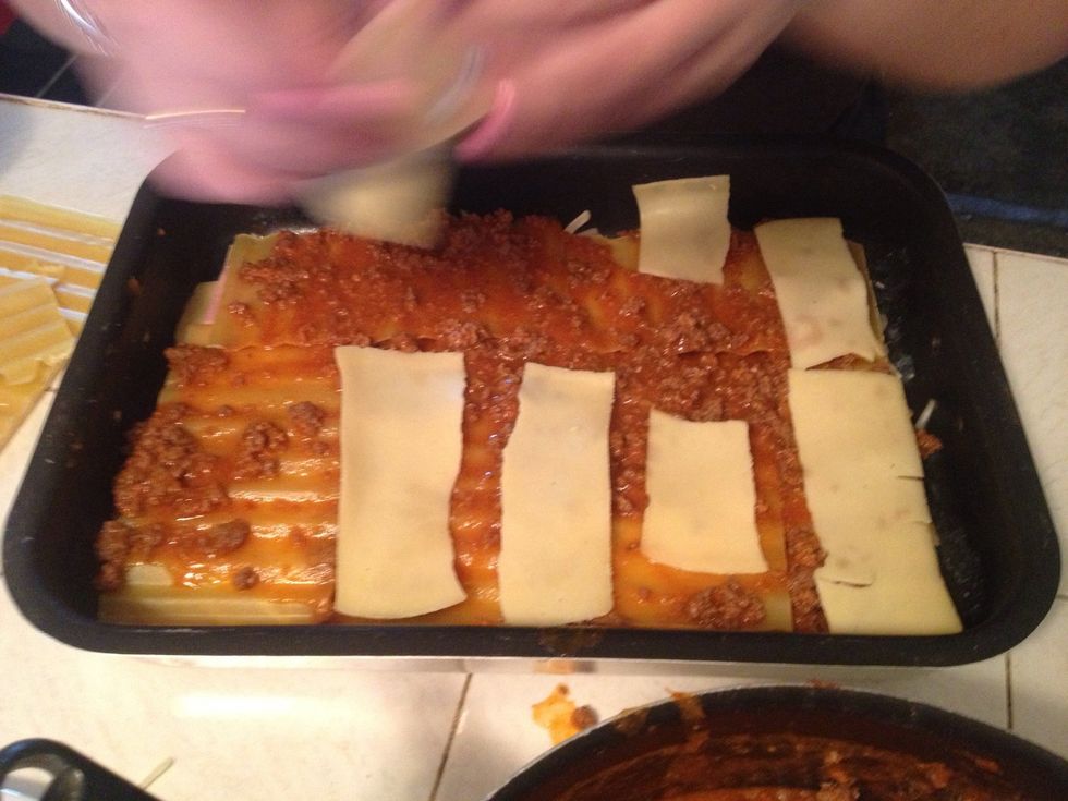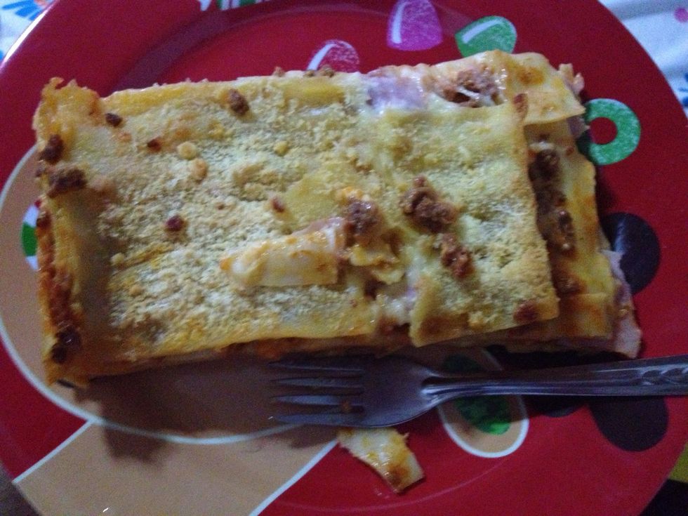 Capas de pasta, salsa bechamel, carne, queso amarillo y jamón