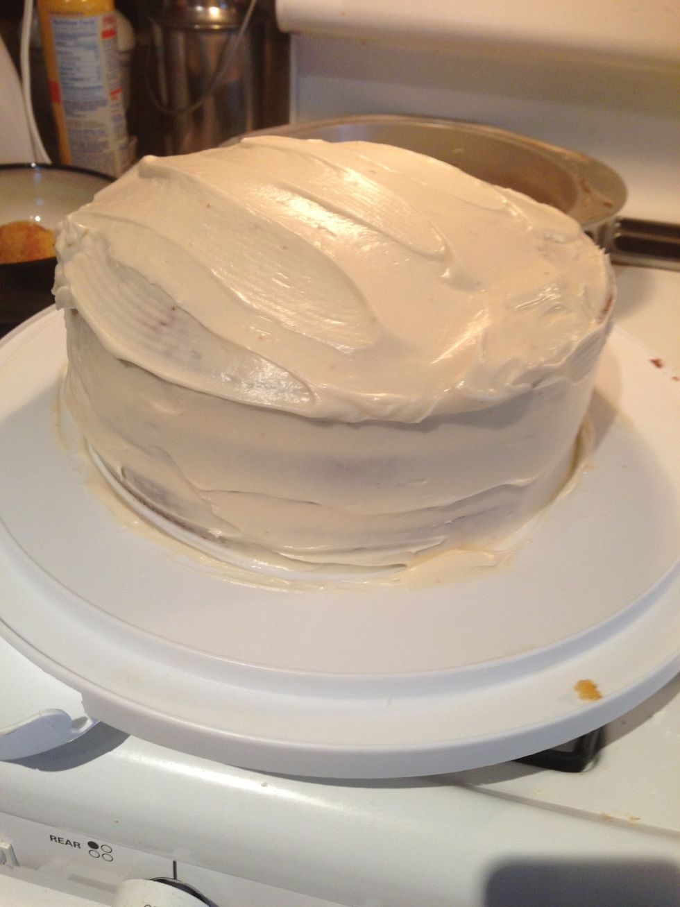 Spread the remaining generous amount of frosting all over the top and around the sides of the three layered cake.