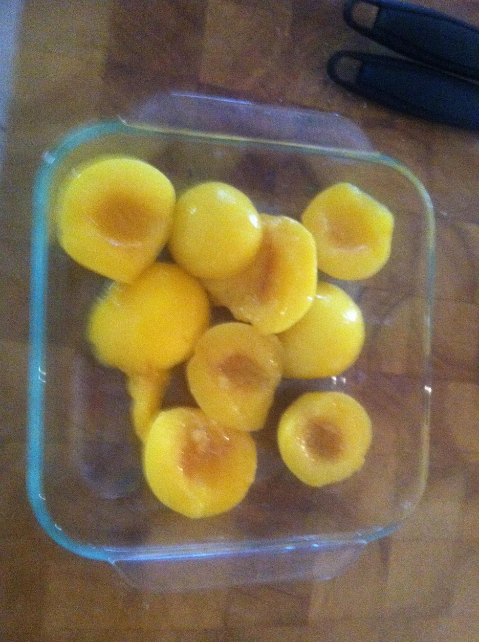 Line your Pyrex small dish with 1lb of canned sliced peaches. Top them with the 1lb of chicken.