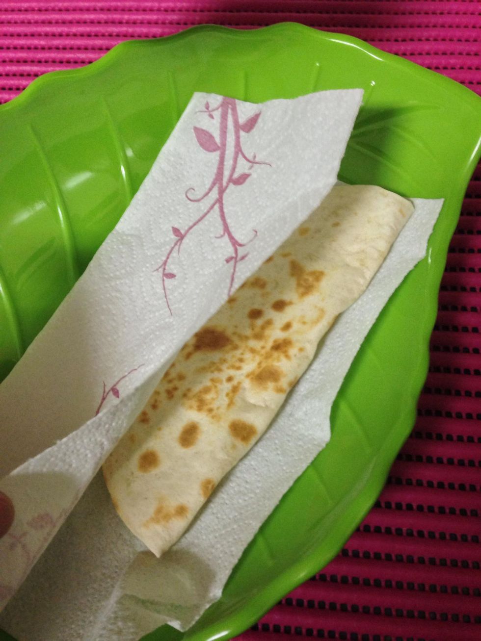 Flap it over to about half the tortilla, pull it down slightly and turn it around after 10 seconds. Let the other side heat up as well for another 15 seconds.