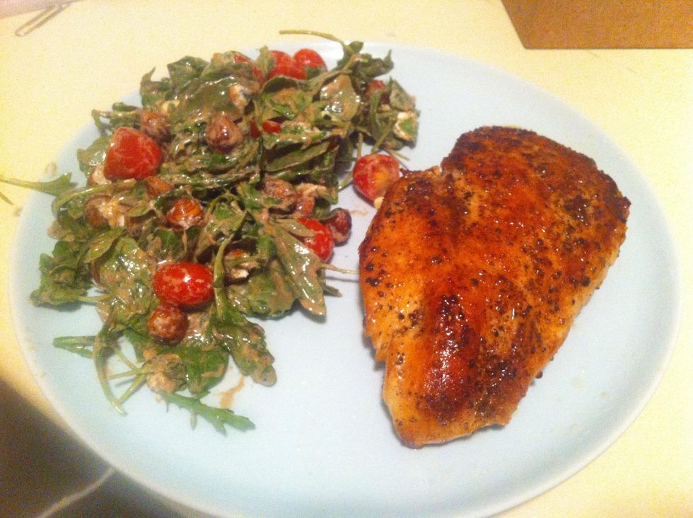 While the chicken is resting, add 3 parts olive oil, 1 part balsamic vinegar to your salad. You can premix it in a jar, or eyeball it like I did.