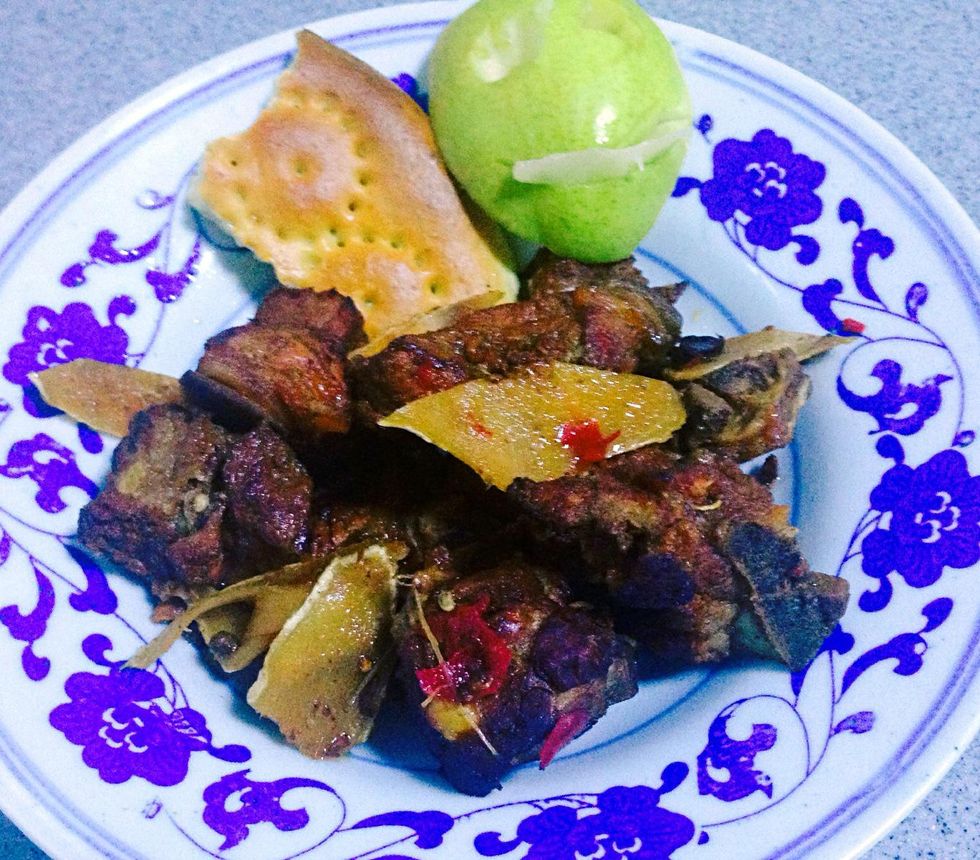 when sugar become dark red, put boiled pork, onion, ginger and garlic in pan.