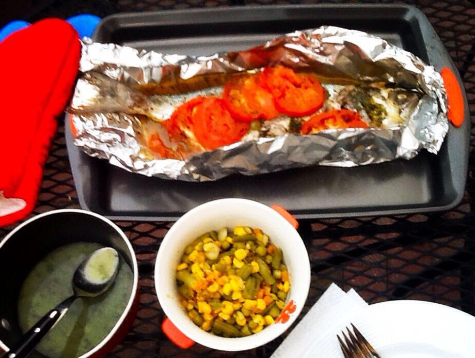 Fan tomato slices atop fish along with remaining olive slices. Complete your foil tent, covering fish completely. The goal here is for the fish to steam through.