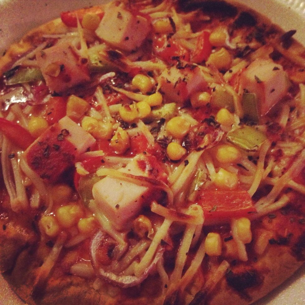 Then add the other ingredients, put as much as you like. I used onions, corn, ham, red and green pepper.