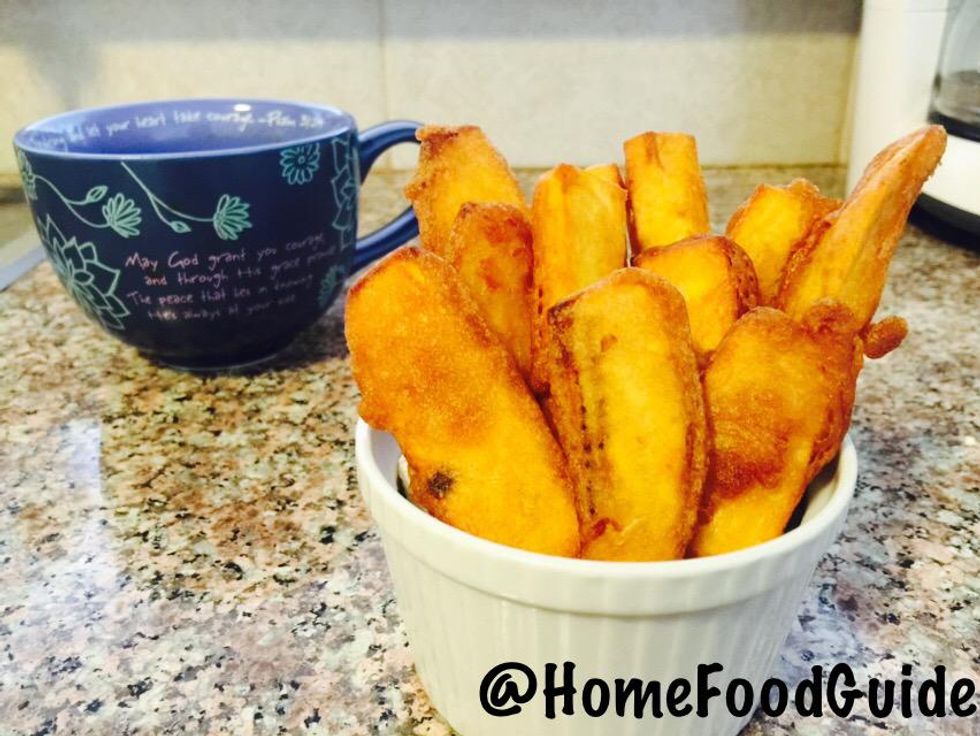 Heat oil in a pan, dip the plantain slices in the batter and fry them to a crisp golden color.