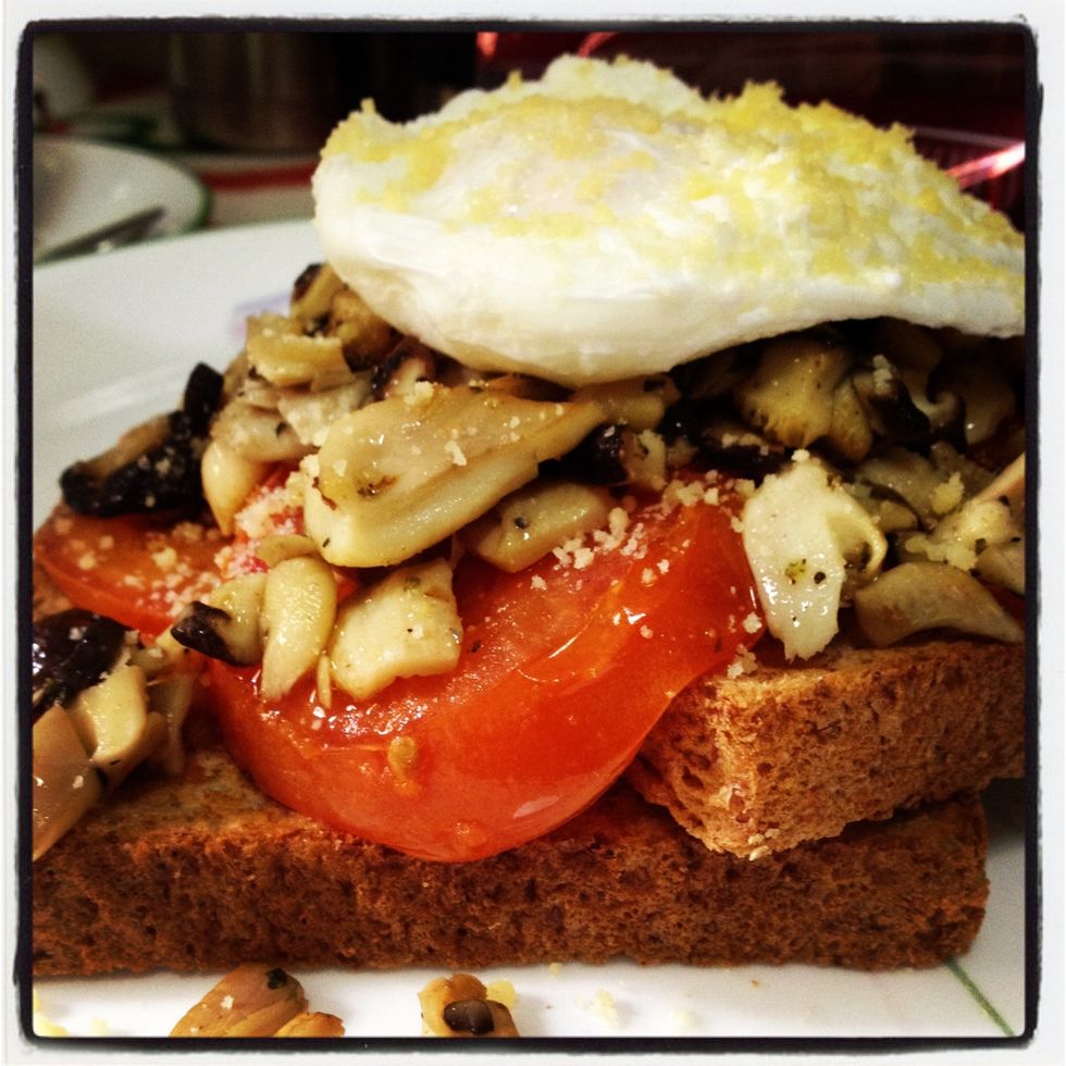 Toast bread. Top it with tomatoes, mushrooms and poached egg. Sprinkle Parmesan cheese. Bismillah!