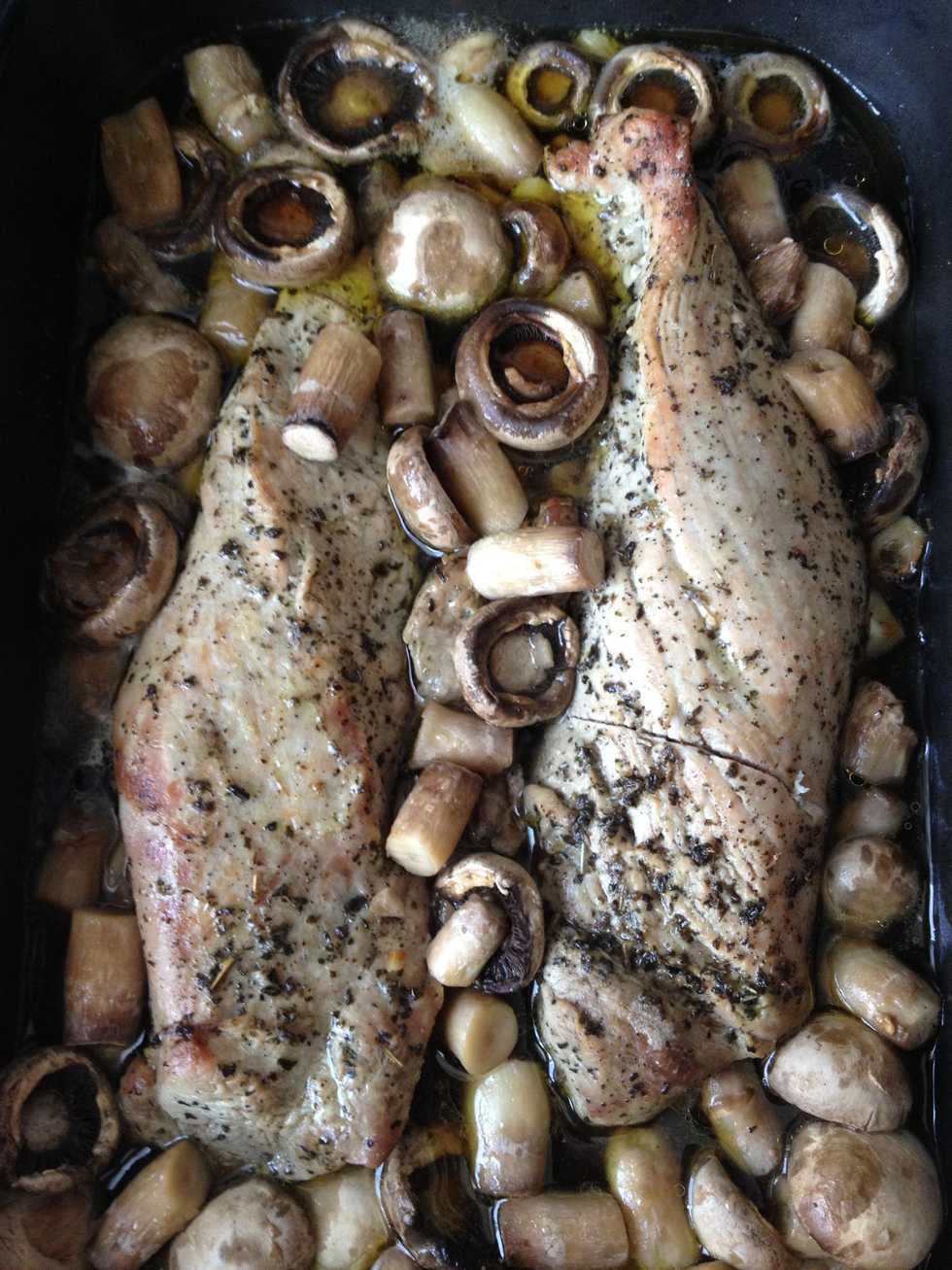 And add them to the pan. Lower temperature to 200 C and cook it for another 30 minutes