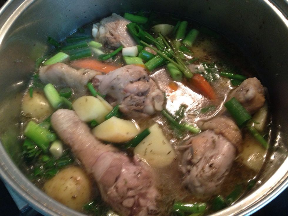 Add potatoes, shallots and carrots, continue to simmer for 30 mins.