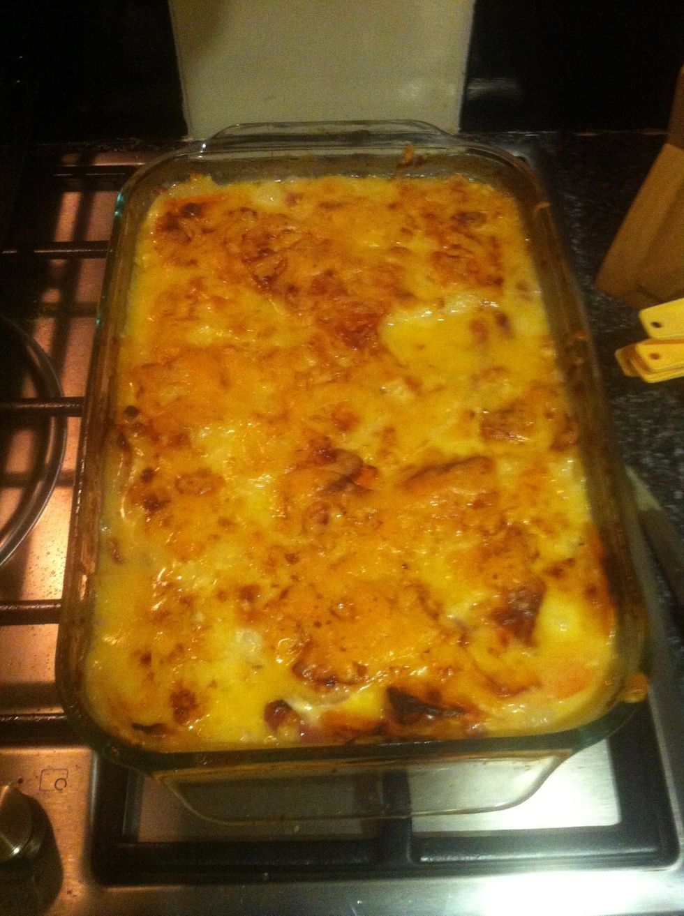 Place in a medium temp oven until potato is cooked and cheese is golden brown on top.