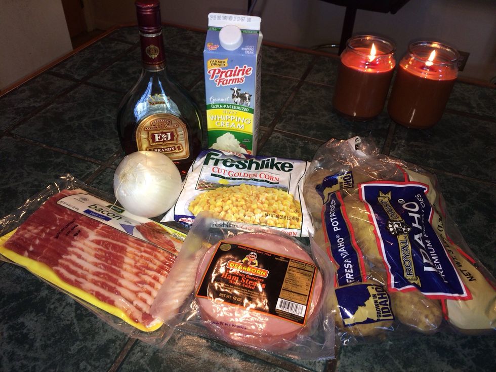 Stir in flour and let cook for a couple minutes before adding cream and Brandy. Stir like mad for a few moments before combining the corn and potatoes and all their water. Finally add the chopped ham.
