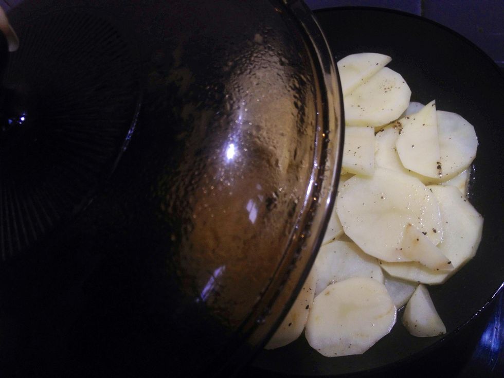 Place potatoes in medium non-stick pan, season with salt & pepper,