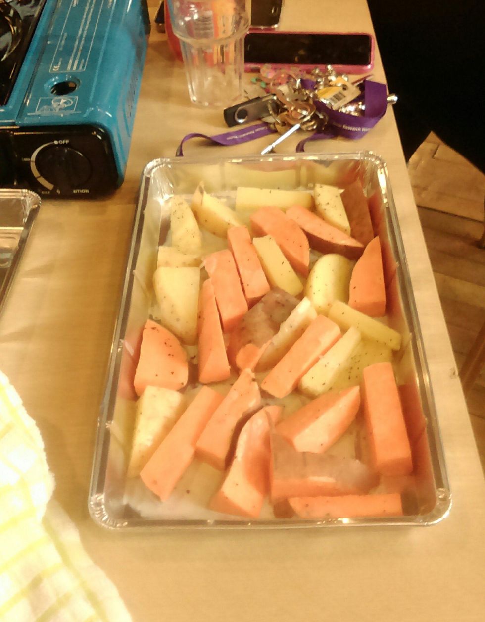 Cut the potatoes/ sweet potatoes into wedges.Put the wedges into a bowl, season with salt and pepper and add the melted lard. Put onto a tray and bake in the oven for 30 - 40 minutes.Enjoy the wedges!