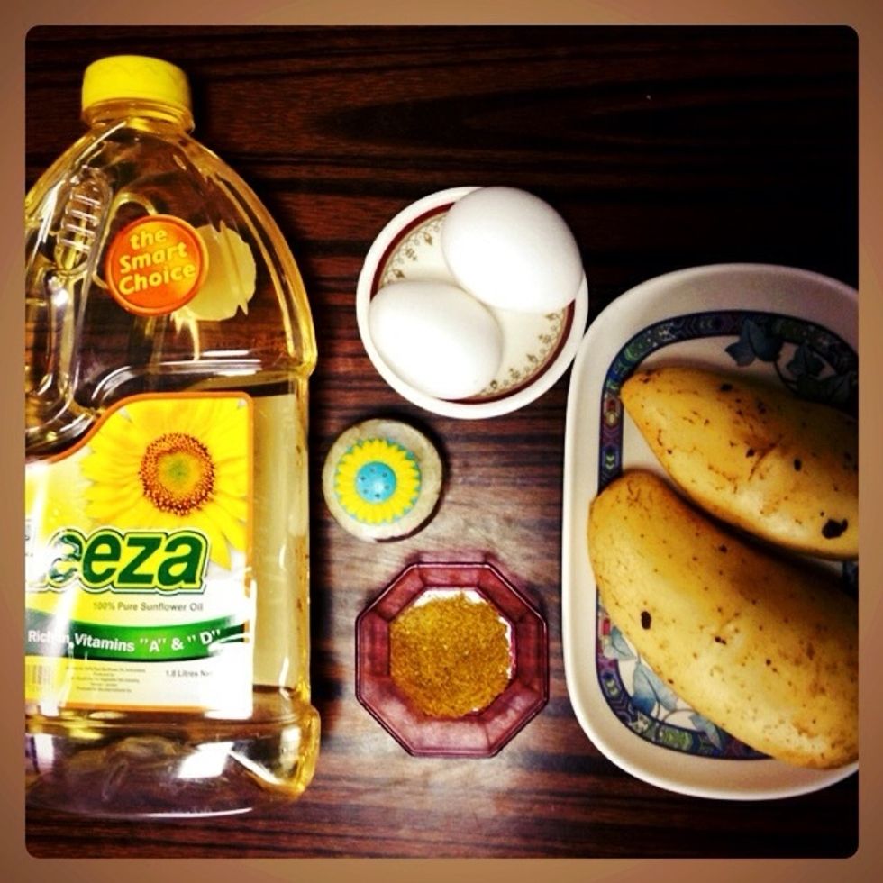 Put the potatoes in a frying pan then put eggs, Salt and pepper and start mixing.