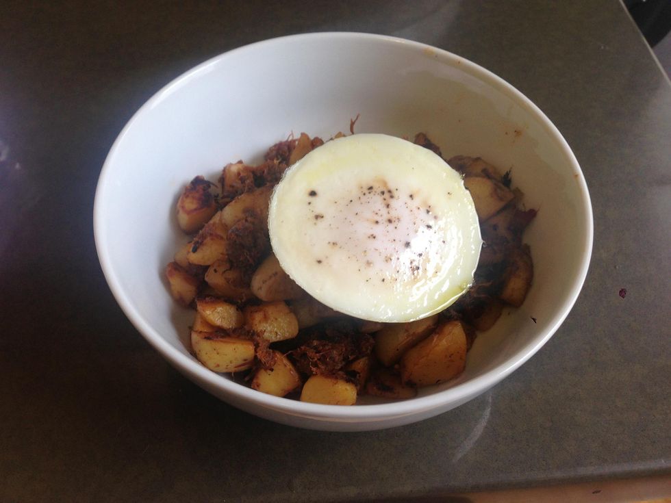A great way to use up the leftovers from that giant pork shoulder you cooked last weekend. Also works with pretty much any other meat — corned beef or chopped-up steak would be good too!
