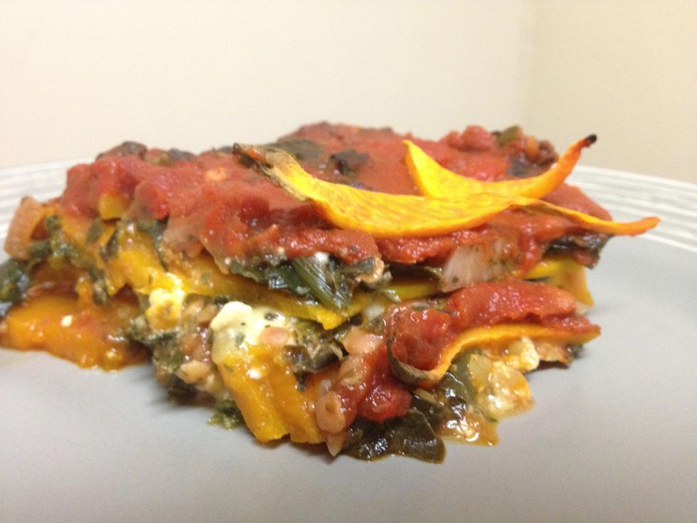 Add another layer of spinach and tomato sauce and decorate with leftover pumpkin if you are so inclined