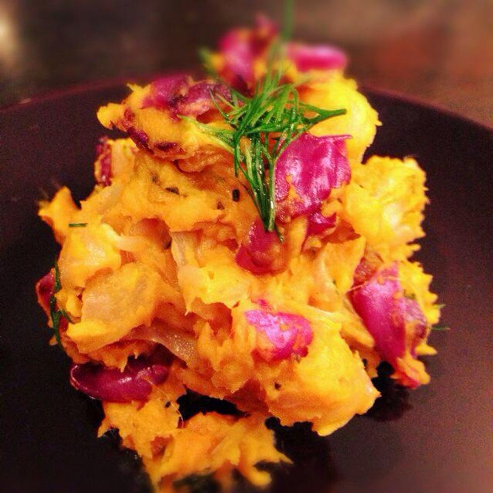 Mix mashed pumpkin in a bowl with onion and cabbage then add mayonnaise and dill Add salt and pepper to taste