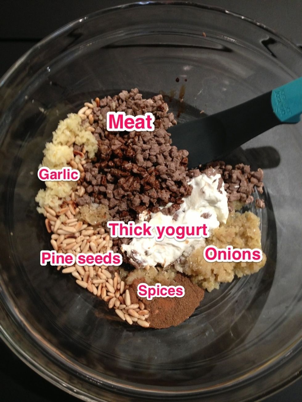 In a big mixing bowl put the cooked onions, the half cooked meat, the grilled pine seeds. The spices the 2 TBsp of yogurt, salt,. Taste and adjust.
