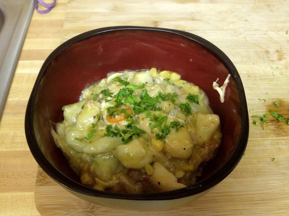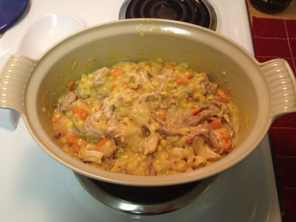 After 10 minutes add the corn and both cans of soup. Leave to heat through while preparing the chicken.