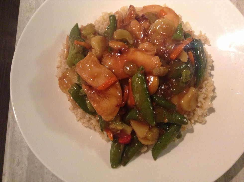 Slice or cube chicken and add to stir-fry sauce. Marinate in the refrigerator for 15 minutes.