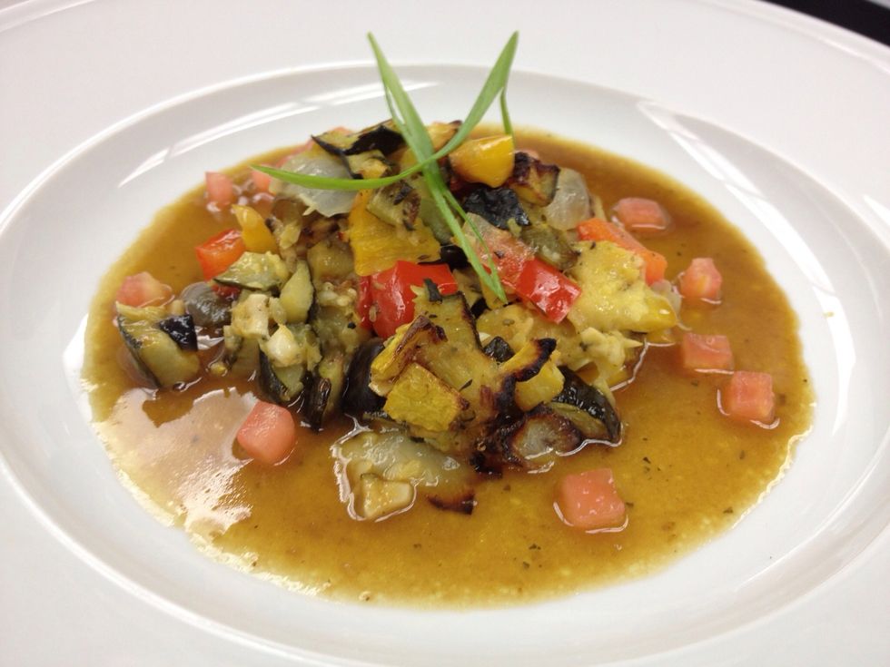 Place ratatouille in the center of the plate, spoon sauce to surround it.