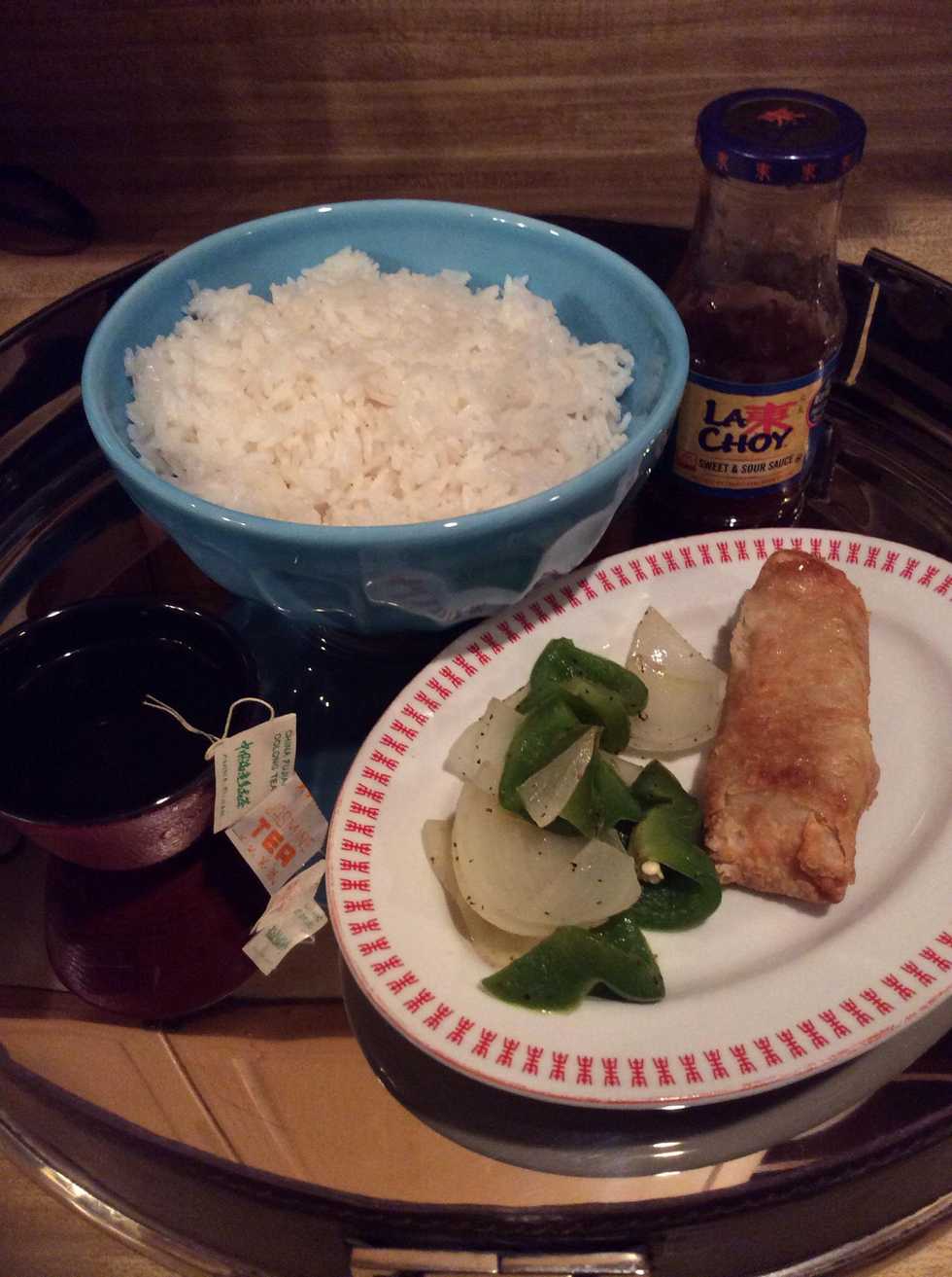 This recipe makes about 3 cups of fluffy rice. Leftover rice is perfect for breakfast eggs and sausage. I made my rice to put under some steamed onion and green pepper and a side veggie egg roll.