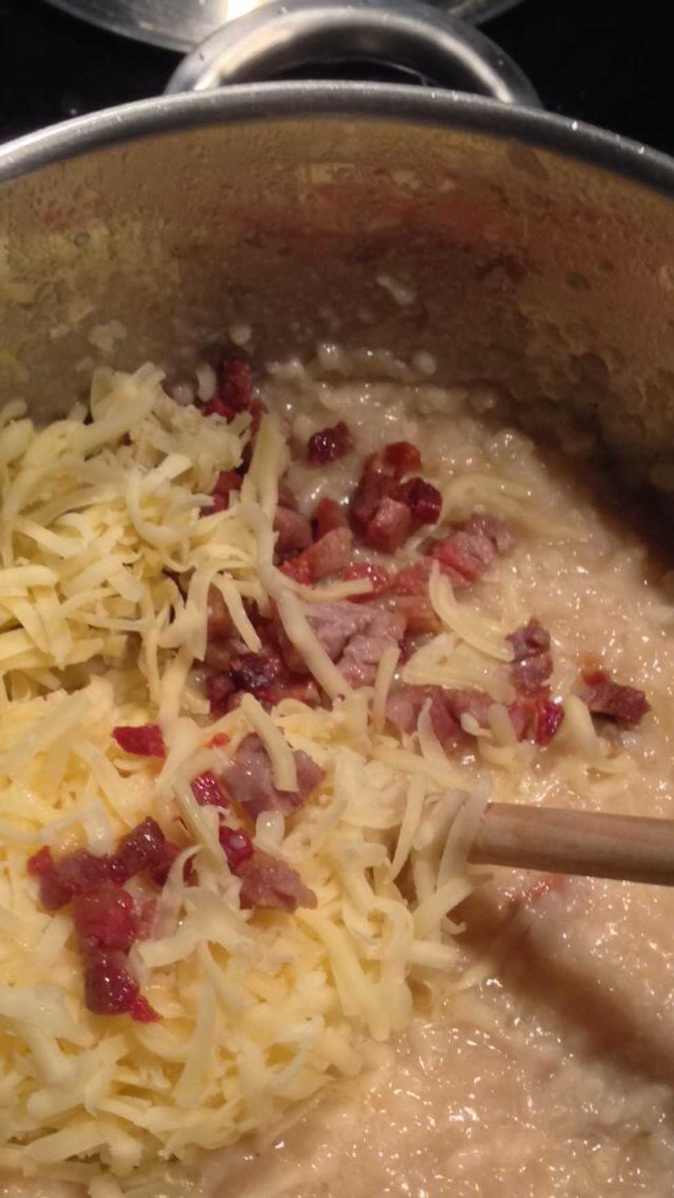 Nach 20 Minuten immer wieder mal probieren. Wenn gewünschte Konsistenz erreicht ist, Speck, Käse, Pilze und Butter beigeben. Umrühren. Zudecken. Vom Herd nehmen.