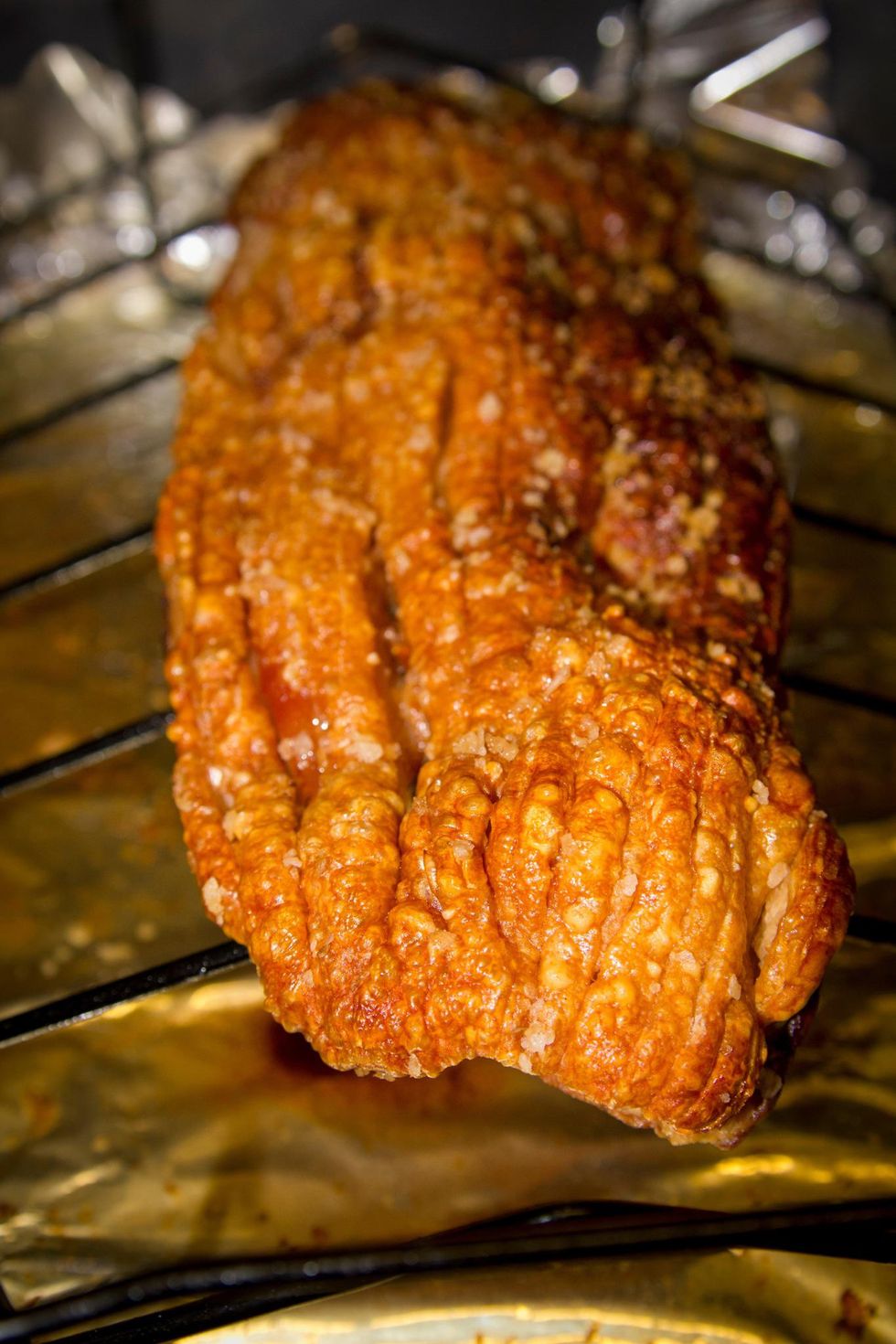 Place the skin on a wire rack and pop in a foil lined roasting tin. Cook at 240 degrees centigrade for 20 minutes and then reduce heat to 220 and cook for another 20-30 minutes