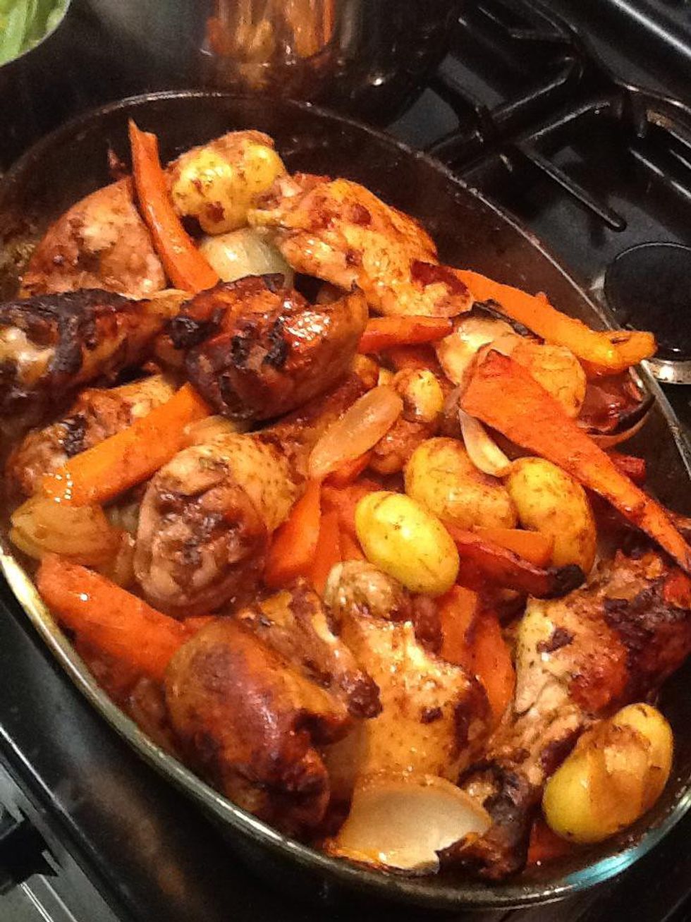 After 40 minutes take the foil off of the dish and mix and baste the chicken and vegetables. Place back in the oven (with the foil removed) for roughly 20-30 minutes.